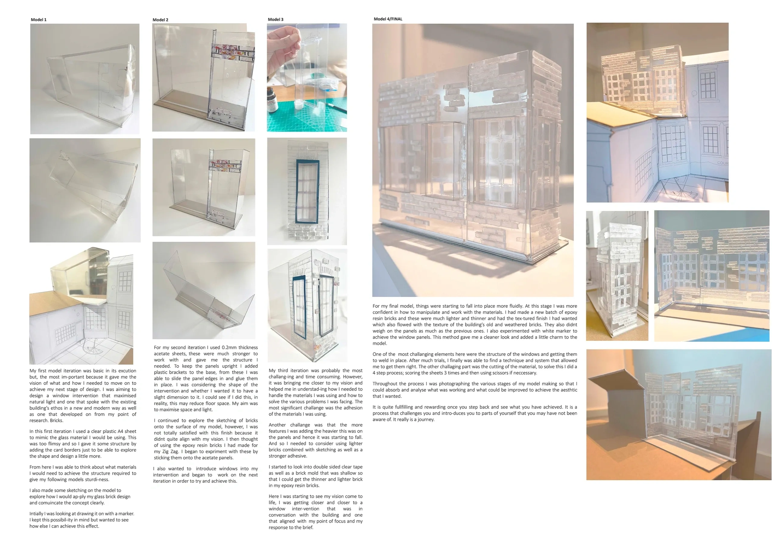 This exploration was part of a design for a modern intervention within a historic Georgian building in Spital Square. Starting from the study of brick as a key traditional material; my concept evolved into using glass brick as a way to preserve the dialogue between heritage and modernity, while bringing in light.